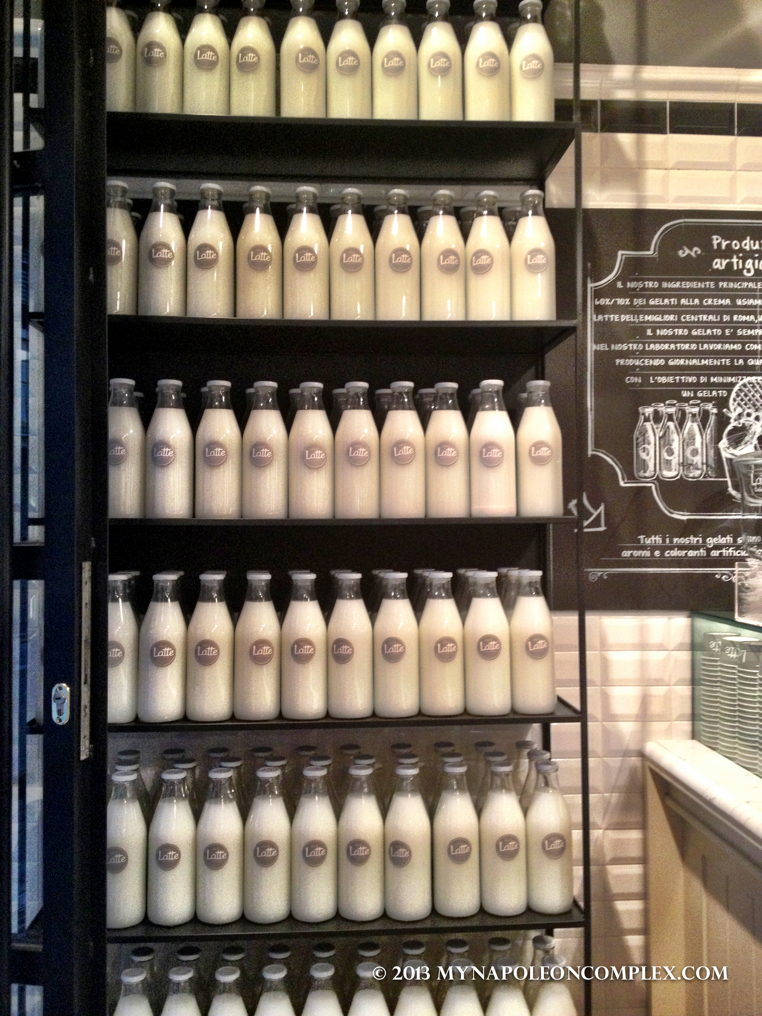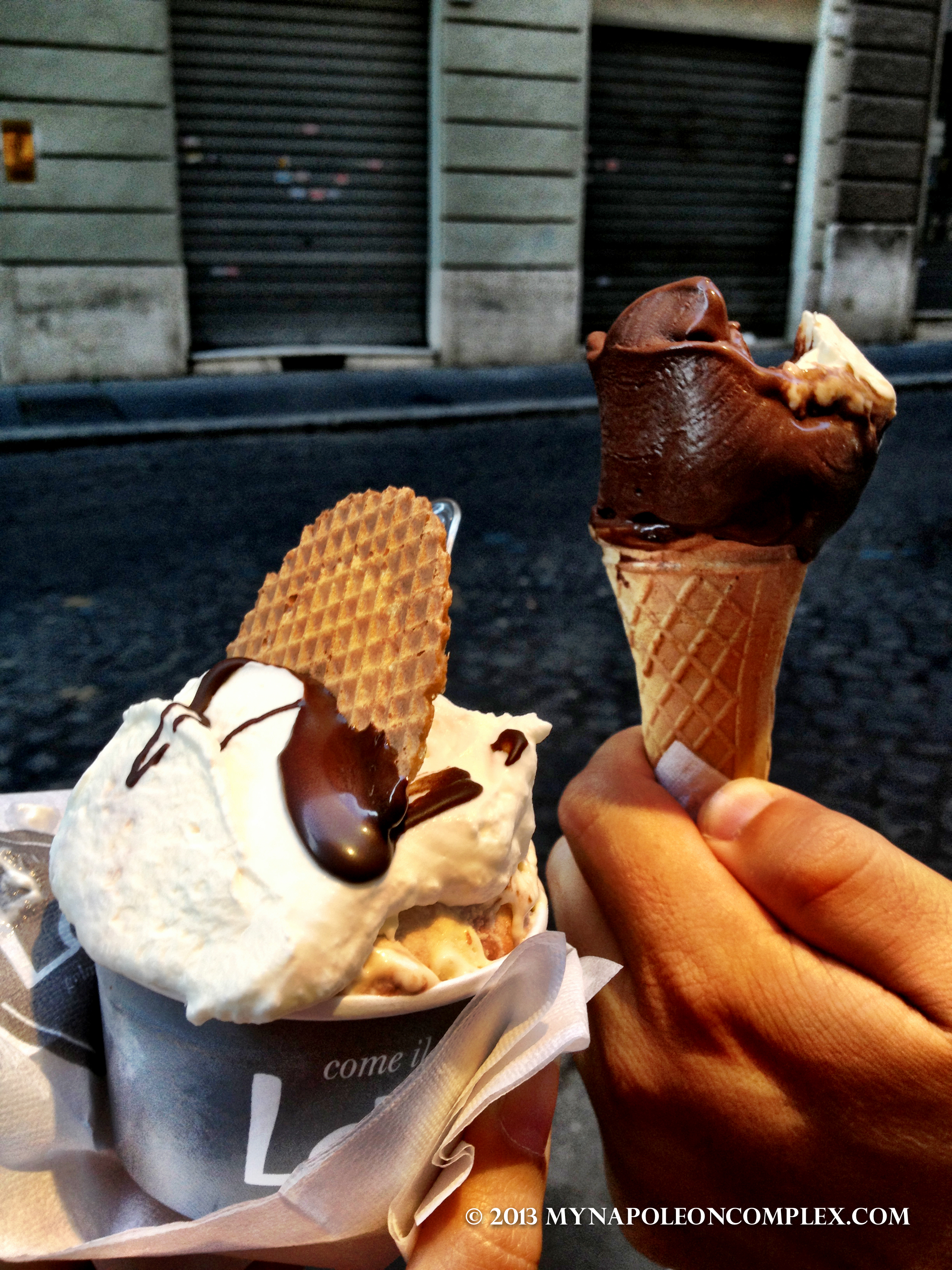 Yesterday, we found the cutest and most delicious gelato shop not far from our hotel called “Come il Latte”. We try to stay away from major tourist shops (I’m sure eventually we’ll find out this probably counts as one), but this place was tucked away in an alley, not full of people but the few that were there were locals, and they made the gelato themselves (another rule we try to stick to). I had their marcarpone and nutella gelato, with whipped cream, chocolate, and a cookie on top. It was absolutely heavenly, creamy deliciousness. By the way, when in Italy, always try their whipped cream or panna. It is NOTHING like the whipped cream in America. Its almost as thick as the gelato itself, which means you can probably stuff your face with just whipped cream and still be full. Jaime had their dark chocolate with vanilla whipped cream and a cookie on top too. I was too wrapped up in my ice cream to try his, but I’m pretty sure he was a happy camper as well. We loved it.